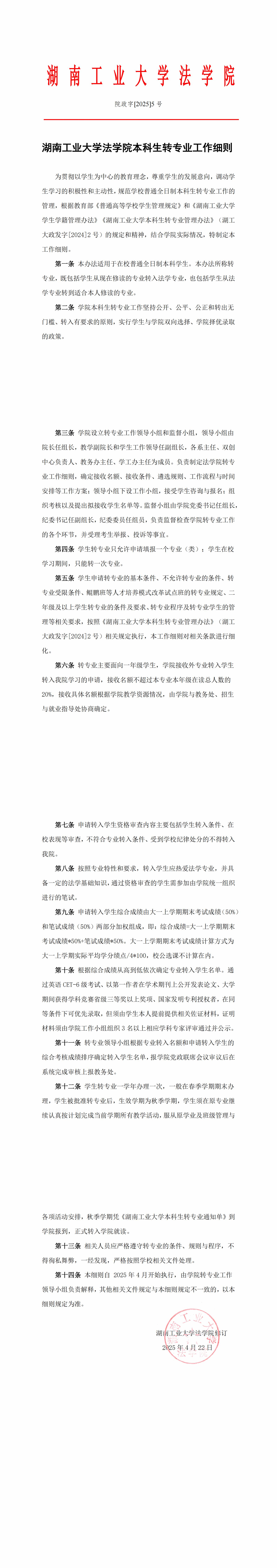 湖南工业大学法学院本科生转专业工作细则